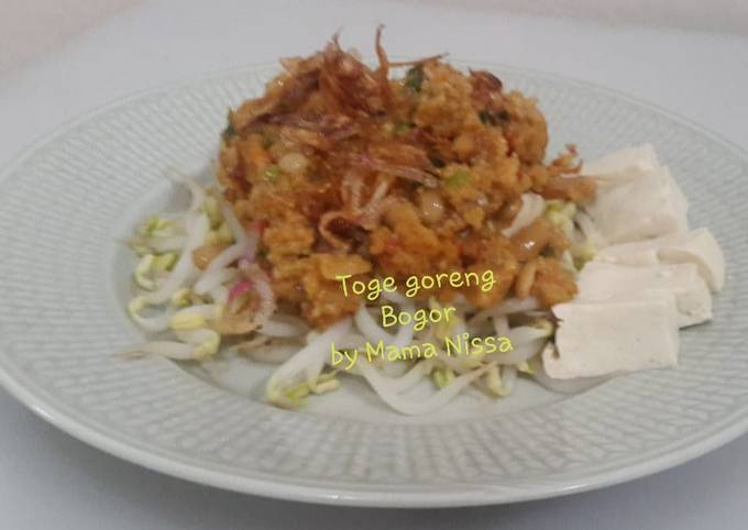 Toge goreng adalah sajian berisi lontong, mie, dan tauge yang sudah diseduh, kemudian disiram kuah berbumbu oncom & tauco. Misalnya seperti toge goreng khas Bogor, Bandung, Betawi atau Jakarta, toge tauco (geco) Cianjur dan beberapa daerah lainnya yang tentunya dengan ciri khas variasi penyajiannya masing-masing. Resep tauge goreng khas Bogor pada kreasi kali ini cukup sederhana. Saus sambal goreng yang disiram diatasnya berasal dari paduan oncom dan bumbu tauco. Toge goreng adalah salah satu kuliner khas Bogor.