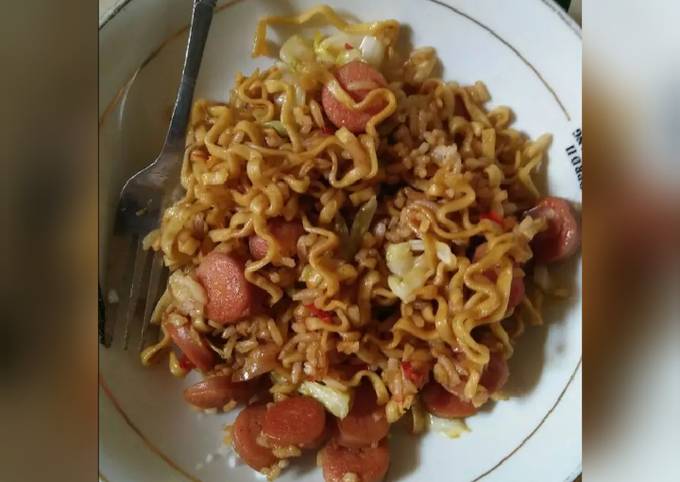 - Masukkan nasi dan mie ke dalam tumisan, aduk rata..